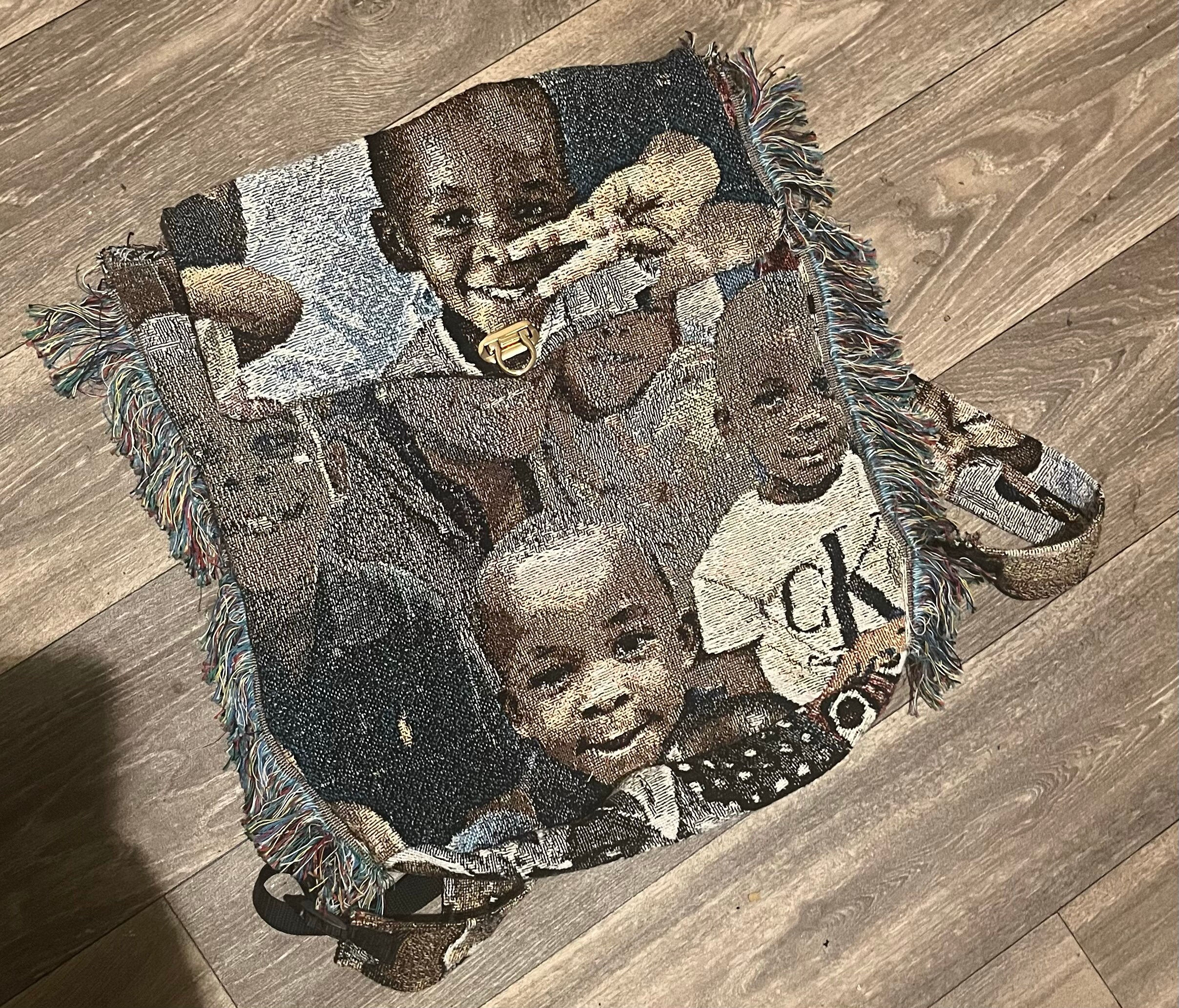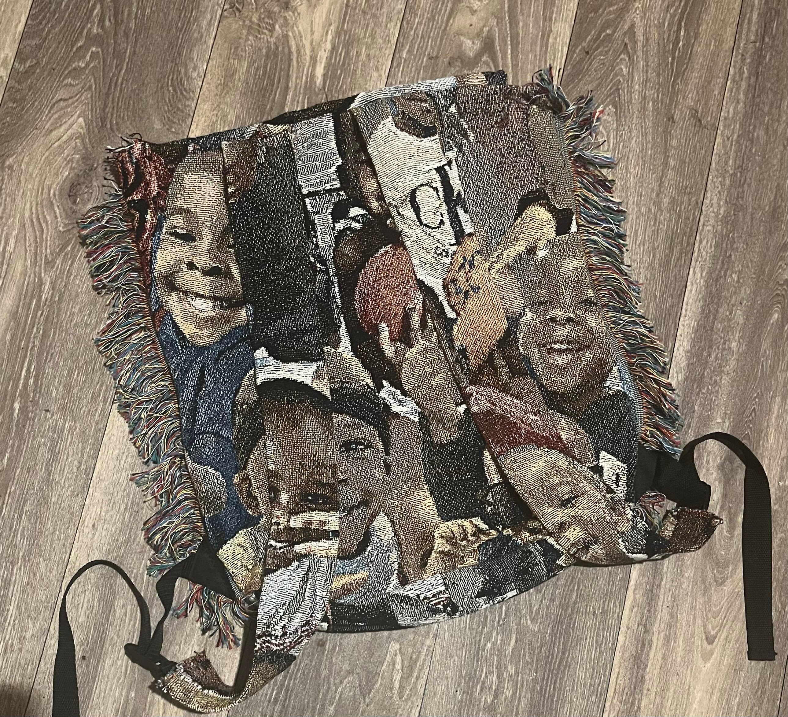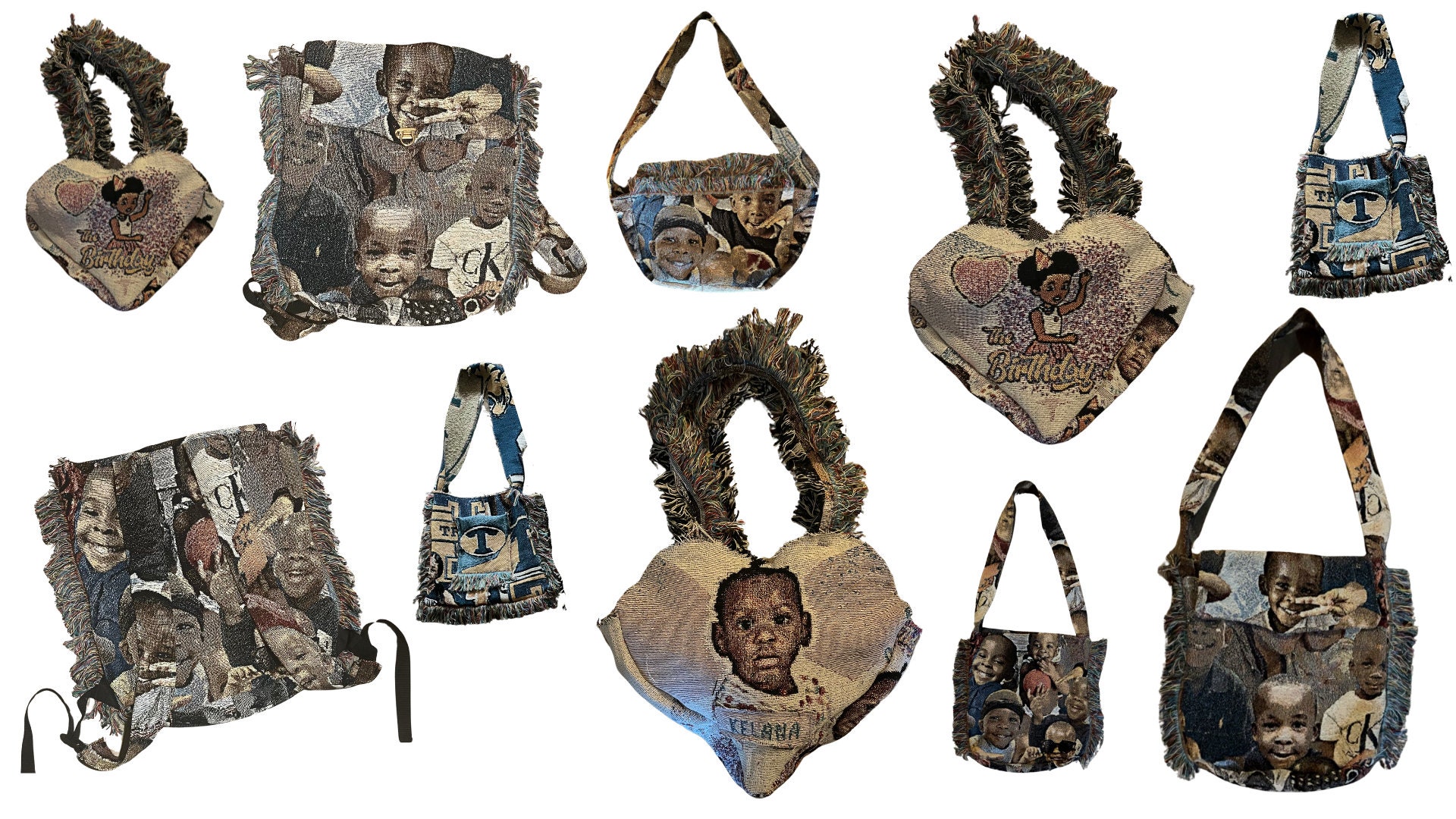 customized bags with any photos. send me your desired photos and I will make a collage or image to order a custom tapestry blanket, then I can make it into whatever choice of bag you would like. I also make clothing from them. feel free to send me inquiries.